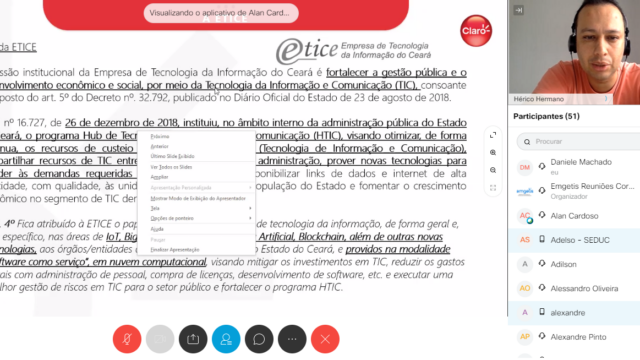 As apresentações tiveram continuidade com a apresentação do case da Etice, feita pelo gerente de Desenvolvimento de Negócios de Soluções Digitais da Claro, Herico Hermano, e do gerente de Consultoria e Inovação em Cyber Segurança da Embratel, Yanis Stoyannis, que apresentou e tirou dúvidas dos participantes sobre a Lei Geral de Proteção de Dados Pessoais (LGPD).