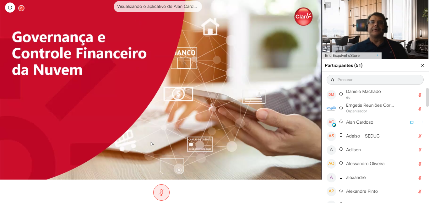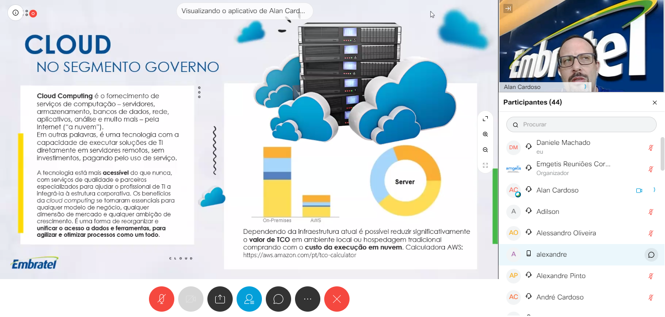 Para iniciar os trabalhos, o gerente de desenvolvimento de negócio na Embratel, Alan Cardoso, fez uma breve apresentação dos temas a serem desenvolvidos, e explanou sobre a experiência da empresa com o governo federal na contratação de multinuvem. Em seguida, o gerente de portfólio de produtos em nuvem da Ustore, Eric Esquivel, falou sobre ‘Governança e controle financeiro da nuvem’.