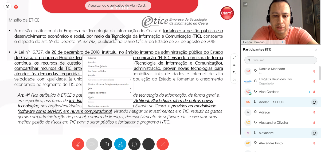 As apresentações tiveram continuidade com a apresentação do case da Etice, feita pelo gerente de Desenvolvimento de Negócios de Soluções Digitais da Claro, Herico Hermano, e do gerente de Consultoria e Inovação em Cyber Segurança da Embratel, Yanis Stoyannis, que apresentou e tirou dúvidas dos participantes sobre a Lei Geral de Proteção de Dados Pessoais (LGPD).